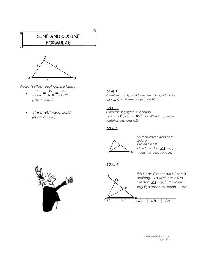 Materi aturan cosinus juga dapat digunakan untuk menentukan besar salah satu sudut pada segitiga sehingga tidak hanya sisinya saja. Trigonometri turunan integral dan contoh soal. Dengan menggunakan konsep jumlah sudut dalam segitiga maka kita akan dapat besarnya sudut di titik c yakni. Sebuah segitiga abc diketahui panjang sisi ac = 6 cm dan sisi bc = 4 cm serta <. Contoh soal dan pembahasan aturan sinus dan cosinus pada segitiga. Aturan sinus cosinus dan luas segitiga diah kusumastuti. Dapatkan pelajaran, soal & rumus aturan cosinus lengkap di wardaya college. Contoh soal aturan sinus dan cosinus 2 berisi kumpulan soal soal aturan sinus dan aturan cosinus dengan kesulitan setingkat soal un level kognitif aplikasi. Soal soal cosinus dan aturan beserta pangaturanya.berapakah besar dari sudut d. Contoh soal dan pembahasan tentang aturan cosinus ini disusun untuk membantu murid dalam mempelajari aturan cosinus dan penggunaannya dalam segitiga. Menggunakan analogi yang sama, kemudian diperoleh aturan cosinus untuk segitiga abc sebagai berikut. Pengertian dan teorema 3 april 2018 ika desi b 214. Beberapa soal yang diberikan merupakan soal un tahun lalu, baik untuk materi aturan sinus dan aturan cosinus.